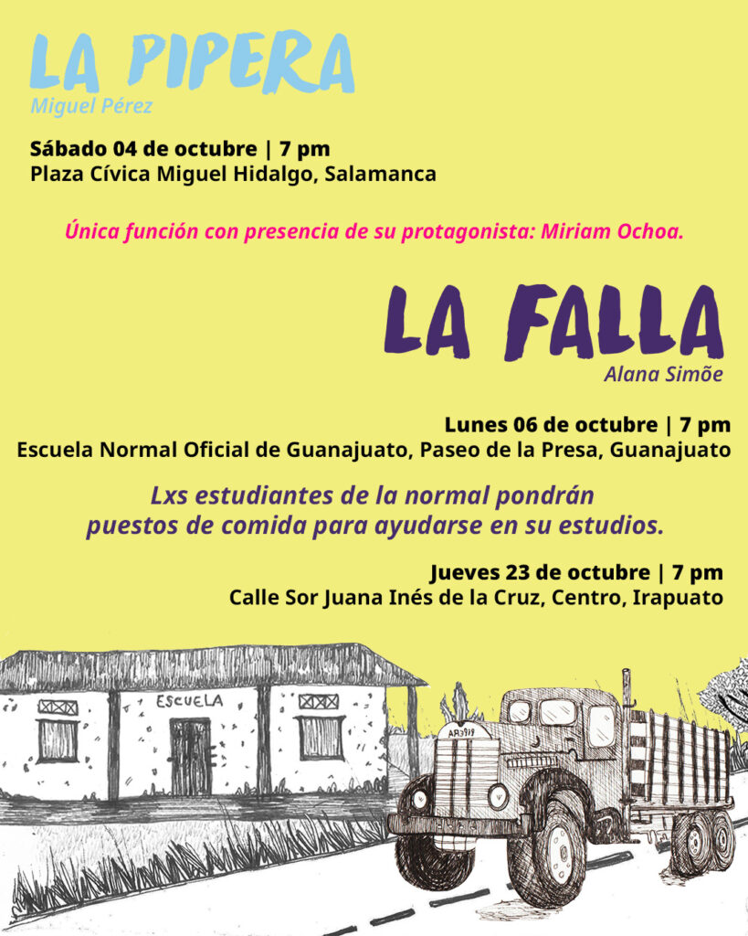 Este año quisimos abrazar nuestro territorio: por eso la mayoría de las funciones serán en Guanajuato capital, en 10 sedes locales que incluyen dos plazas públicas del centro. Nos emociona mucho compartir películas que dialogan con nuestro estado y con quienes lo habitan: Sujo, filmada en comunidades de Guanajuato y que por primera vez regresa a Cajones, una de esas localidades; La Pipera, la historia de Miriam Ochoa, pionera irapuatense del transporte de carga pesada, que veremos junto con ella y su familia; y Un cuento de pescadores, dirigida por Edgar Nito, cineasta originario de Irapuato.
